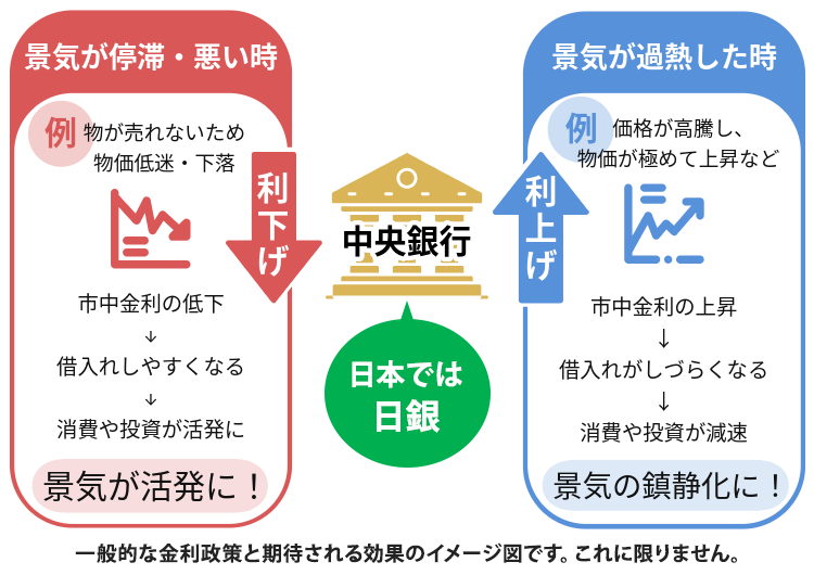 ニュースなどでよく聞く「利上げ」「利下げ」は、この政策金利の水準を上げたり下げたりすることを指します。