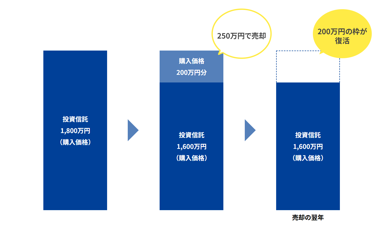 たとえば、簿価200万円の投信が値上がりし、250万円で売却できたとします。その場合には、翌年に200万円の非課税保有限度額が復活します。簿価がいくらなのかは、利用金融機関の保有財産表示ページで確認できますし、金融機関に問い合わせてもいいでしょう。