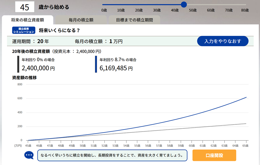 また、あまり資金に余裕がないため、NISAを始めていいのか不安になるかもしれませんが、まずは始めることが大切です。仮に、セゾン投信の「セゾン資産形成の達人ファンド」を想定利回り8.7%※で、45歳から65歳までの20年間、月1万円ずつ積み立てたとしたら、元本240万円が約617万円に増えていたと試算できます。